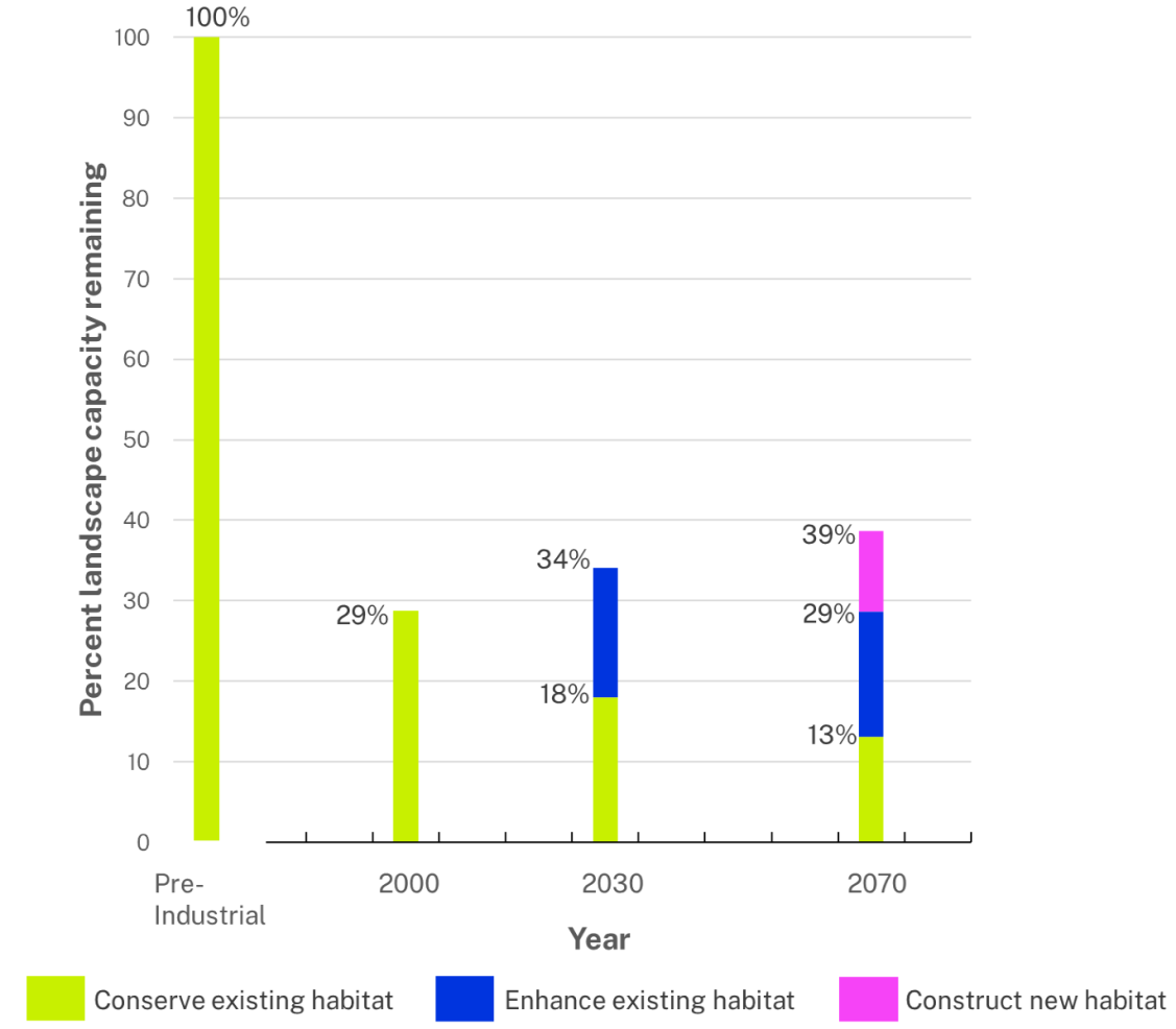 - In the absence of significant added conservation efforts, from 2000 to 2070 a further 16% loss from pre-industrial times is expected, due solely to projected climate change impacts (no further clearing or habitat construction considered).