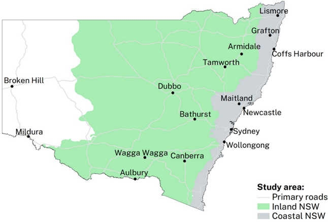 The project considered the koala’s need to move across large distances to disperse and reach habitat resources, while maintaining viable populations, and that koala feed tree distributions are themselves subject to climate impacts. Modelling was undertaken separately for inland and coastal NSW (Figure 1) to account for differences in these 2 regions before being combined.