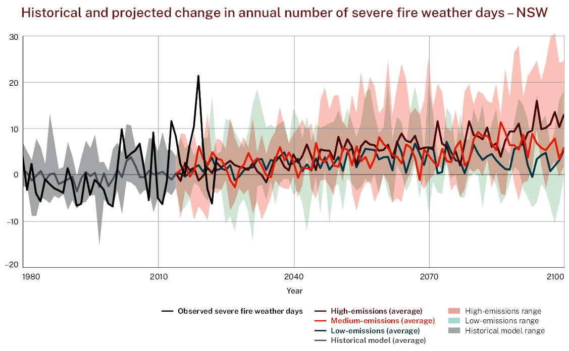 - increases to severe fire weather days will occur across most of NSW, with many regions projected to experience a doubling or even tripling of severe fire weather days by the end of the century under a high-emissions scenario.